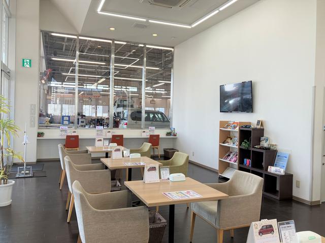 広々とした明るいショールームでおくつろぎください!カウンター席からは整備の様子を見ることが出来ます!