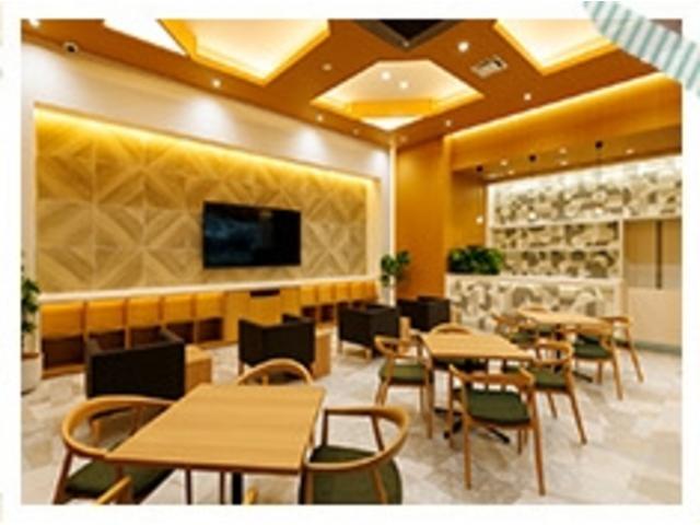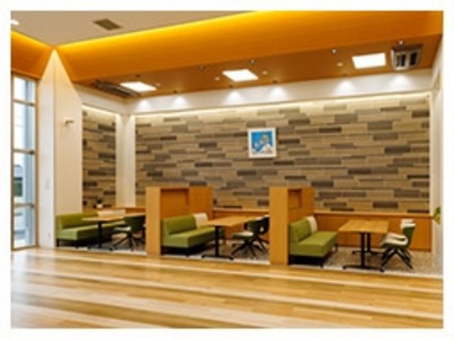 点検待合ラウンジには、お一人用のソファ席と4人掛けテーブルがございます。ダイハツカフェでごゆっくり