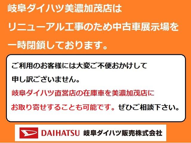 U−CAR美濃加茂店は岐阜ダイハツ販売(株)が展開する中古車販売店舗です。誠に勝手ながら岐阜ダイハツ 美濃加茂店ではリニューアル工事のため、美濃加茂店の中古車展示場を一時閉鎖しております。岐阜ダイハツ直営店の在庫車を美濃加茂店にお取り寄せすることも可能です。お客様のご連絡ご来店を心よりお待ちしております。アフターメンテナンスの関係上、岐阜県在住でメンテナンスでご入庫頂ける方のみへの販売とさせていただいております。ご了承くださいませ。