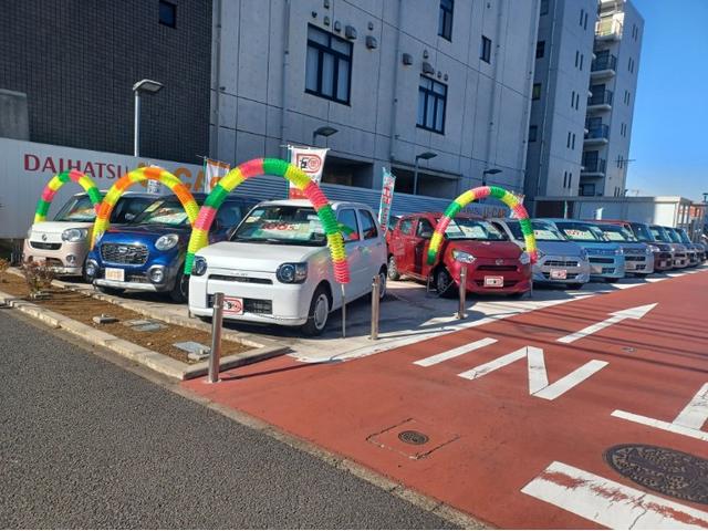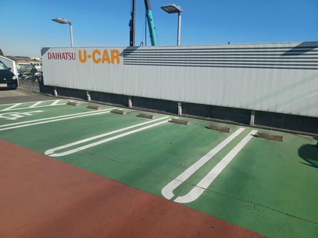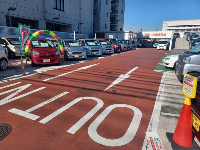 「DAIHATSU U−CAR」の文字をバックにしたお客様駐車場でお出迎えさせていただきます♪