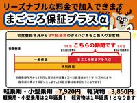 「まごころ保証プラスα」初度登録から3年未満のお車に!わずかな保証料金で「初年度登録から3年または6万kmまで」の保証期間が、初年度登録から5年間または10万Kmまでに保証期間を延長できるのです☆