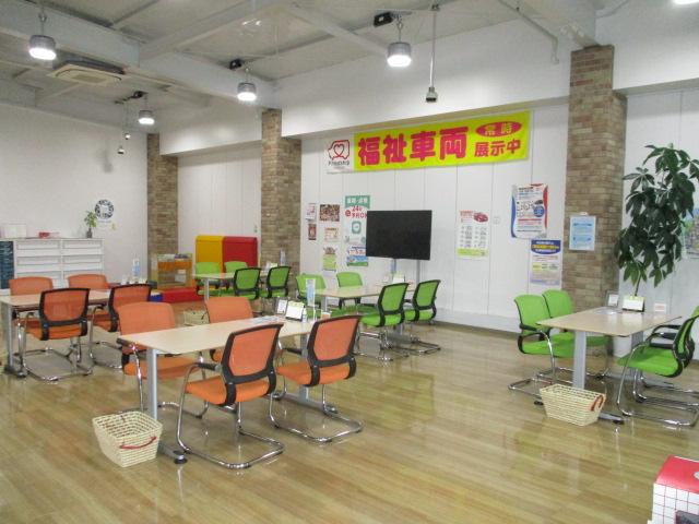 ゆったりとした商談スペースを完備♪ 屋内展示場では福祉車両やコペン、高年式車を展示しております☆