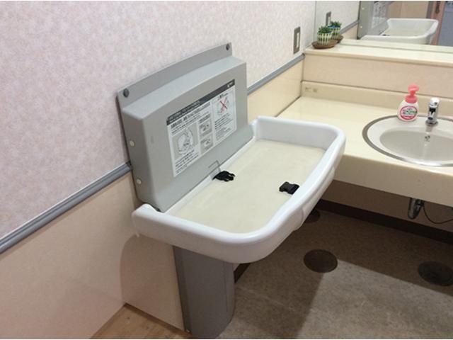 バリアフリー対応のお手洗いとなっております。中にはおむつ交換台も完備しております。