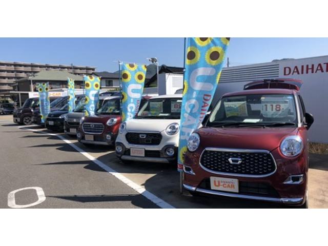 ダイハツディーラー直営の中古車店舗ならではの安心のアフターサービスが自慢です。地域No.1販売店をめざしてがんばっております。新鮮な新車下取車、多数入庫致しております!新車は買えないけど、古すぎる中古車もちょっと。。。と思われている方に朗報!当社で使用の社内車や試乗車などのメーカー保証が受けられる良質な中古車も多数在庫しております。当社営業スタッフにお気軽にご相談下さい!常時軽自動車40台オーバー展示中!当社常時在庫は約350台!その中より満足頂ける車をお探し致します!
