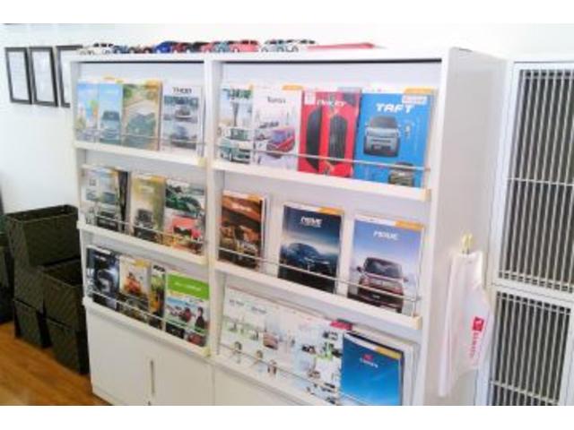 カタログ展示スペースです。気になるお車がございましたらいつでもお気軽にスタッフにお声がけください。