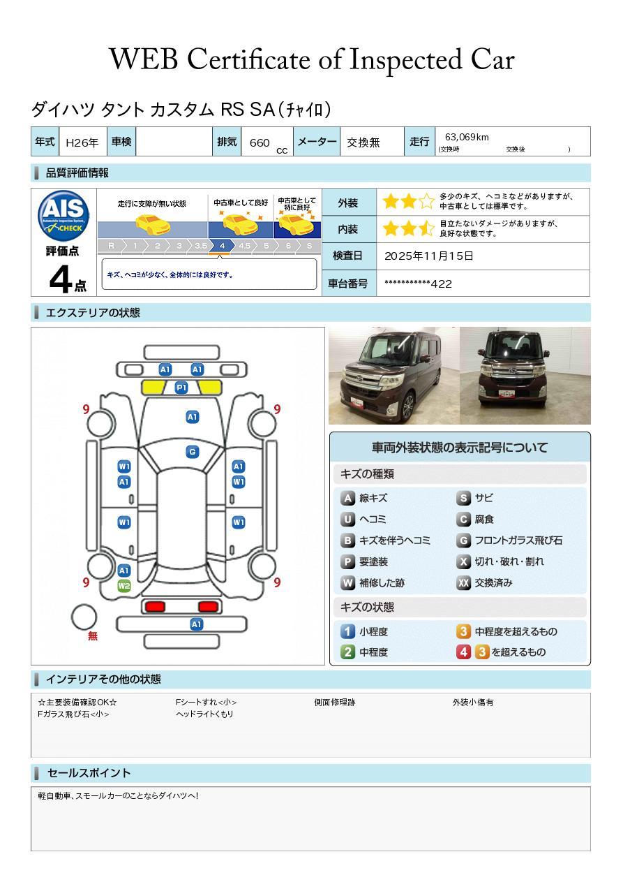 車両状態証明書の見方となります。検査団体によって、表記方法が異なりますので該当車両の車両状態証明書を御確認の上、ご覧ください。
