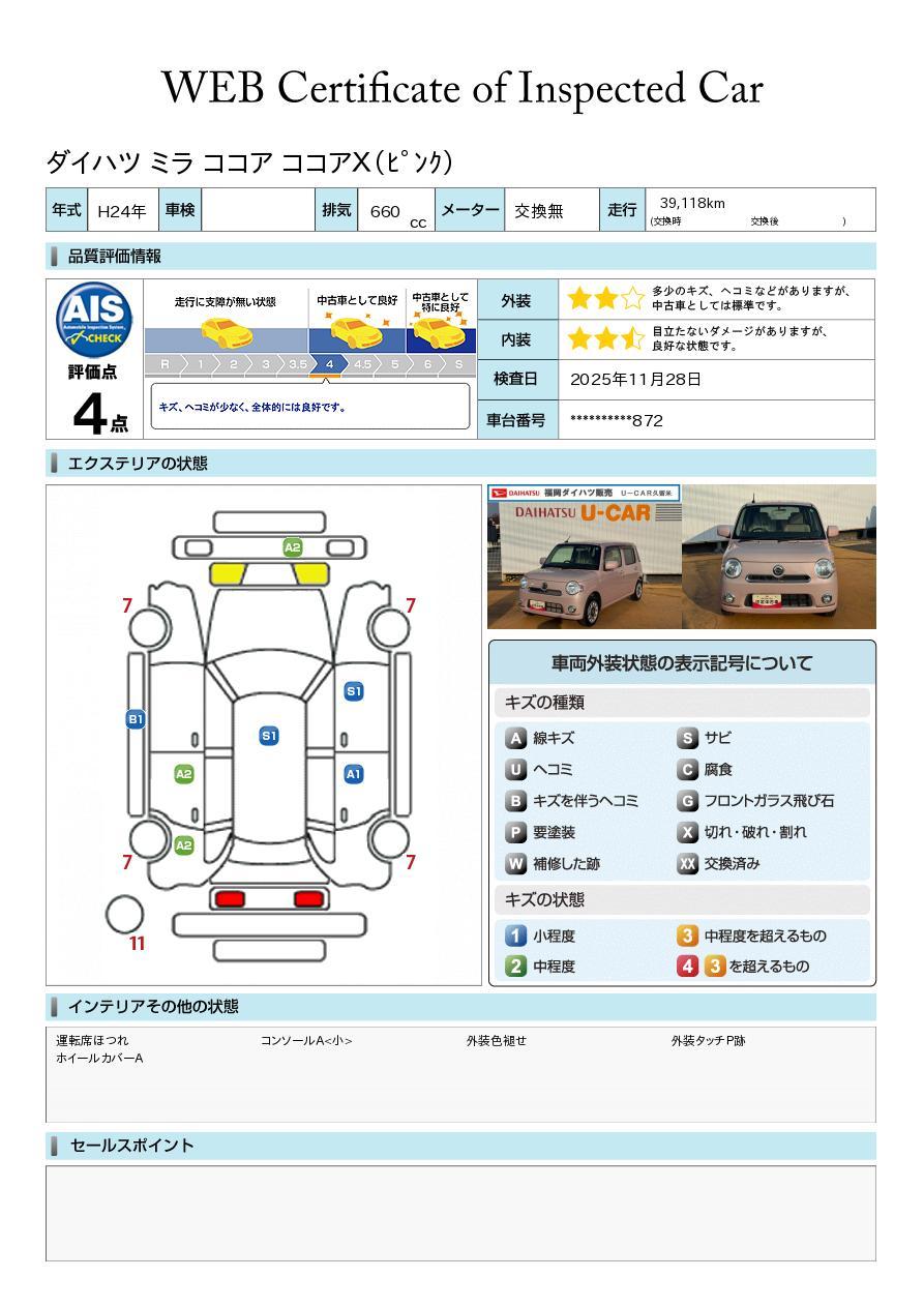 車両状態証明書が付いておりますので、安心してお選び出来ます。詳しくは、スタッフまでお気軽にお問合せください。