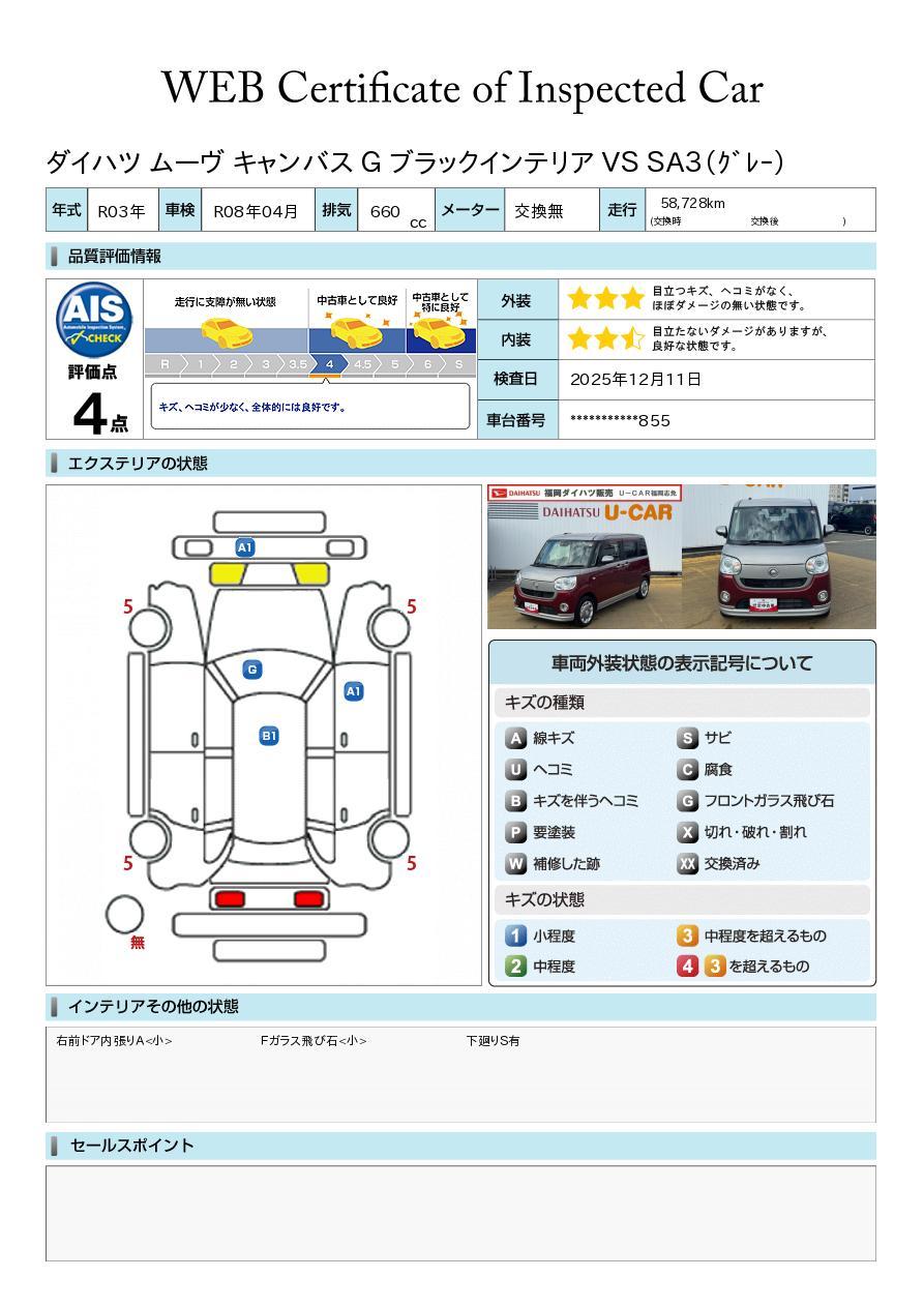 車両状態証明書が付いておりますので、安心してお選び出来ます。詳しくは、スタッフまでお気軽にお問合せください。