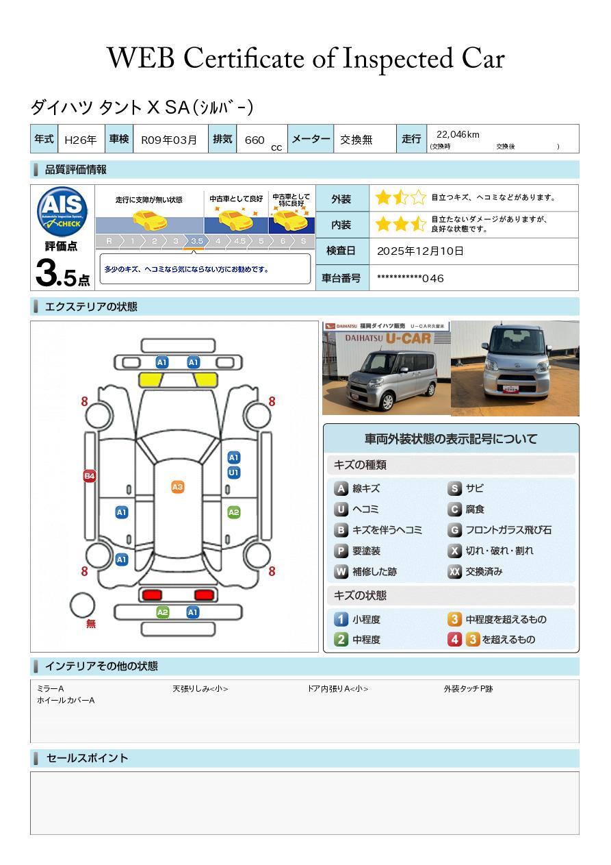 車両状態証明書が付いておりますので、安心してお選び出来ます。詳しくは、スタッフまでお気軽にお問合せください。