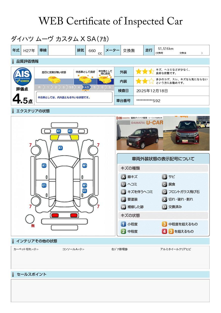 車両状態証明書が付いておりますので、安心してお選び出来ます。詳しくは、スタッフまでお気軽にお問合せください。