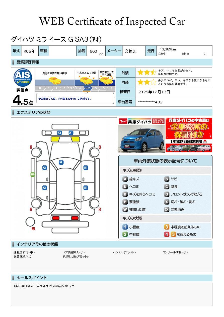 現状の車両の状態に関しましては必ず販売店に確認をお願いします。(2008年10月からの評価基準改定により、一部の車両につき店頭の評価表記と違う場合がございます。詳しくは販売店にお問い合わせください。