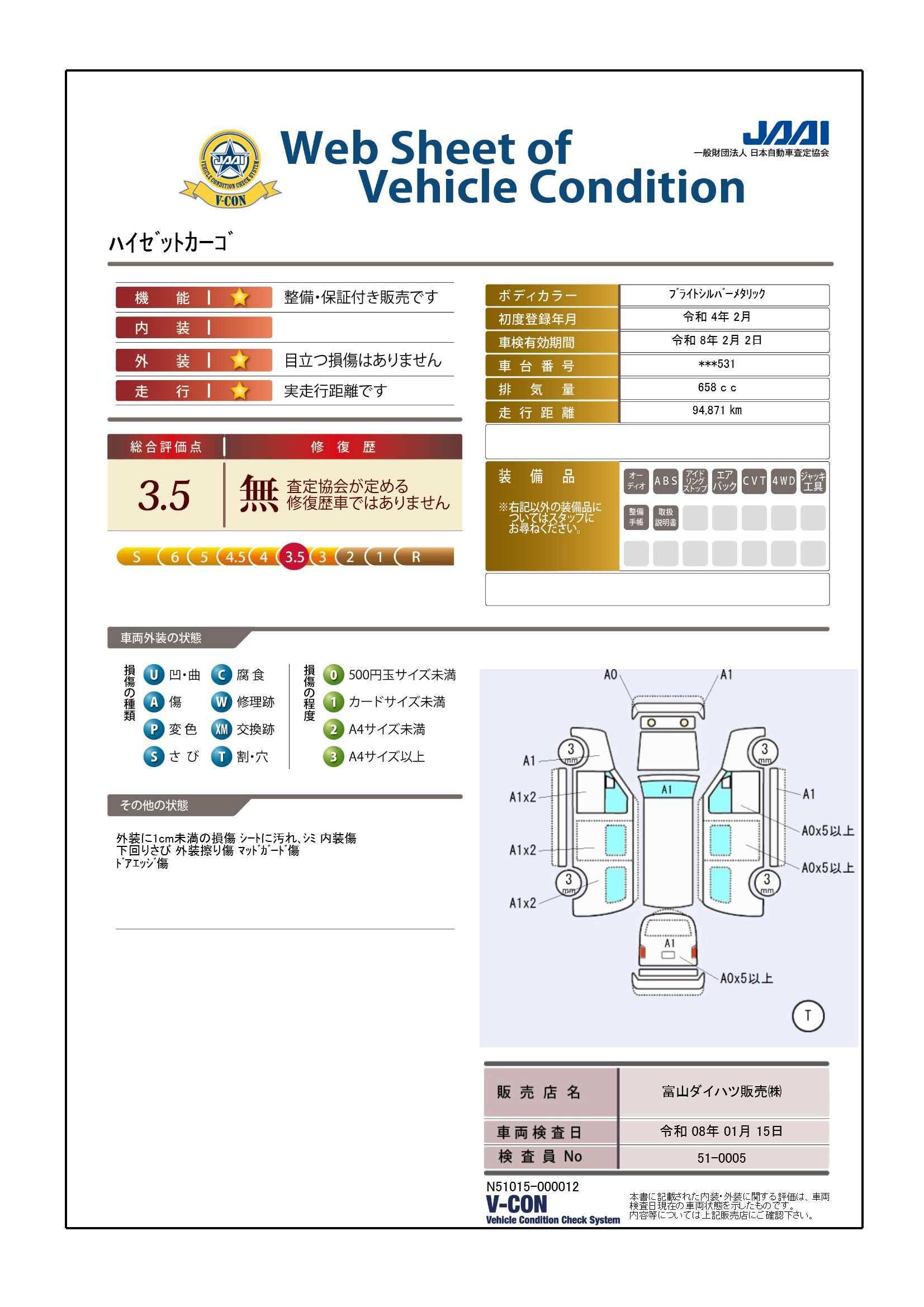 車両状態証明書の見方となります。検査団体によって、表記方法が異なりますので該当車両の車両状態証明書を御確認の上、ご覧ください。