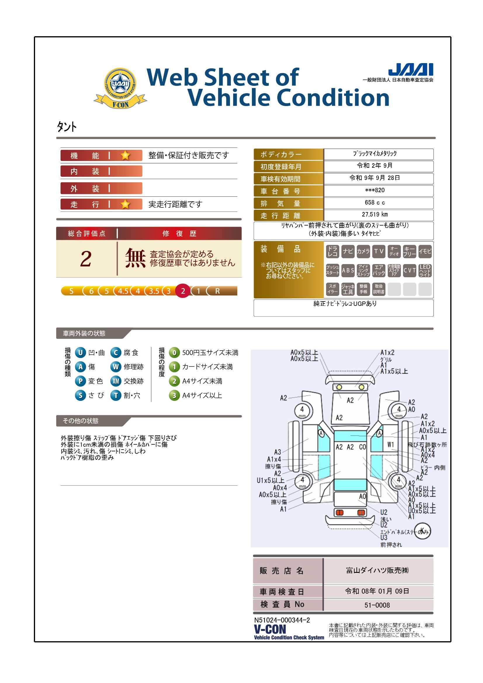 車両状態証明書の見方となります。検査団体によって、表記方法が異なりますので該当車両の車両状態証明書を御確認の上、ご覧ください。