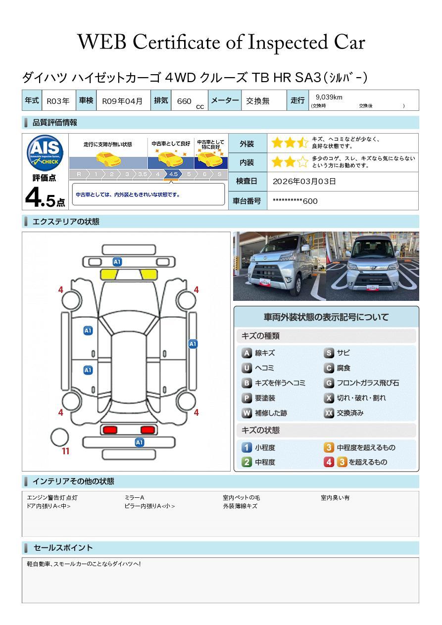 車両状態証明書が付いておりますので、安心してお選び出来ます。詳しくは、スタッフまでお気軽にお問合せください。