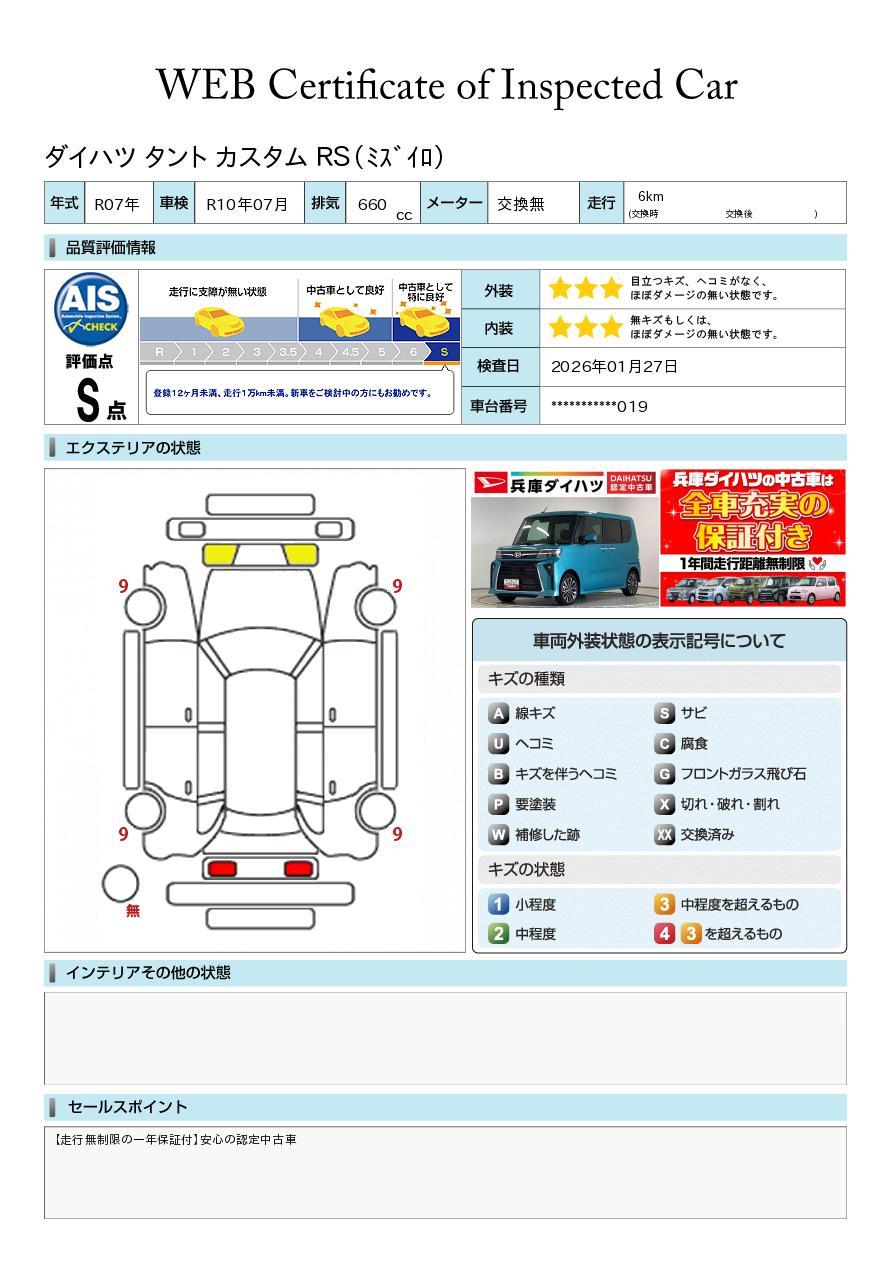 車両状態証明書が付いておりますので、安心してお選び出来ます。詳しくは、スタッフまでお気軽にお問合せください。