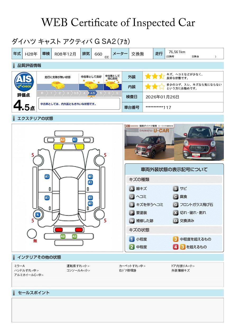 車両状態証明書が付いておりますので、安心してお選び出来ます。詳しくは、スタッフまでお気軽にお問合せください。