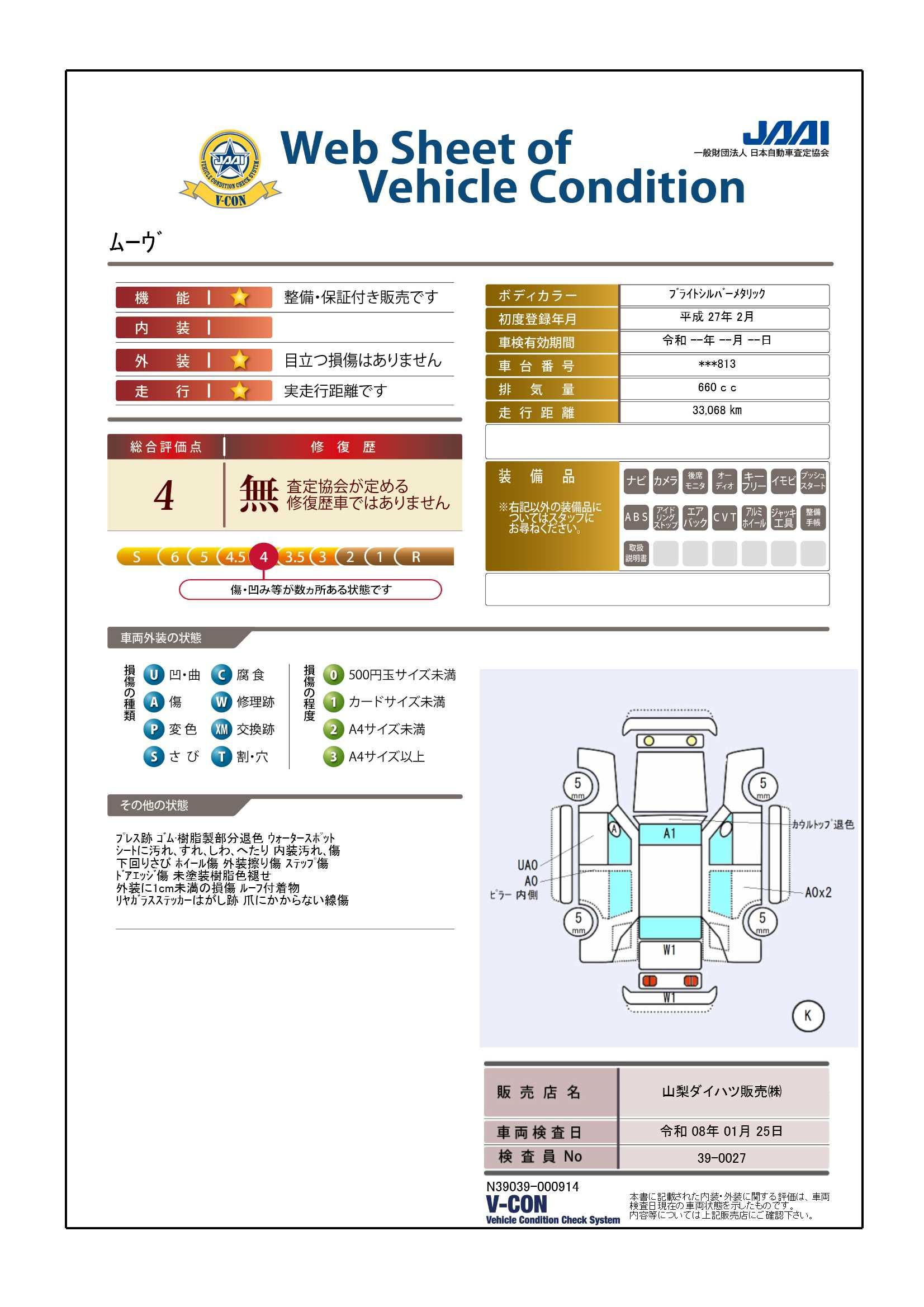 現状の車両の状態に関しましては必ず販売店に確認をお願いします。(2008年10月からの評価基準改定により、一部の車両につき店頭の評価表記と違う場合がございます。詳しくは販売店にお問い合わせください。