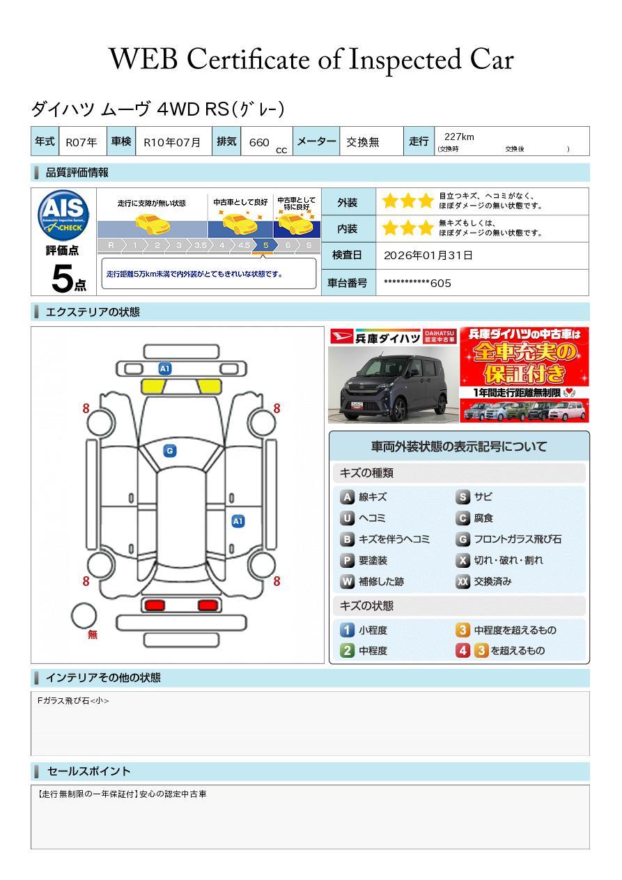 車両状態証明書が付いておりますので、安心してお選び出来ます。詳しくは、スタッフまでお気軽にお問合せください。