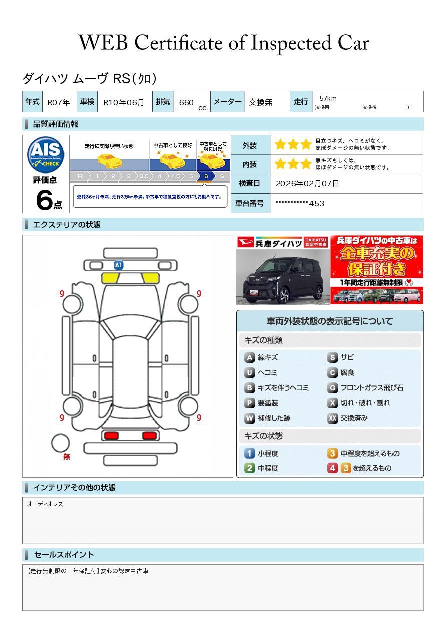 車両状態証明書が付いておりますので、安心してお選び出来ます。詳しくは、スタッフまでお気軽にお問合せください。