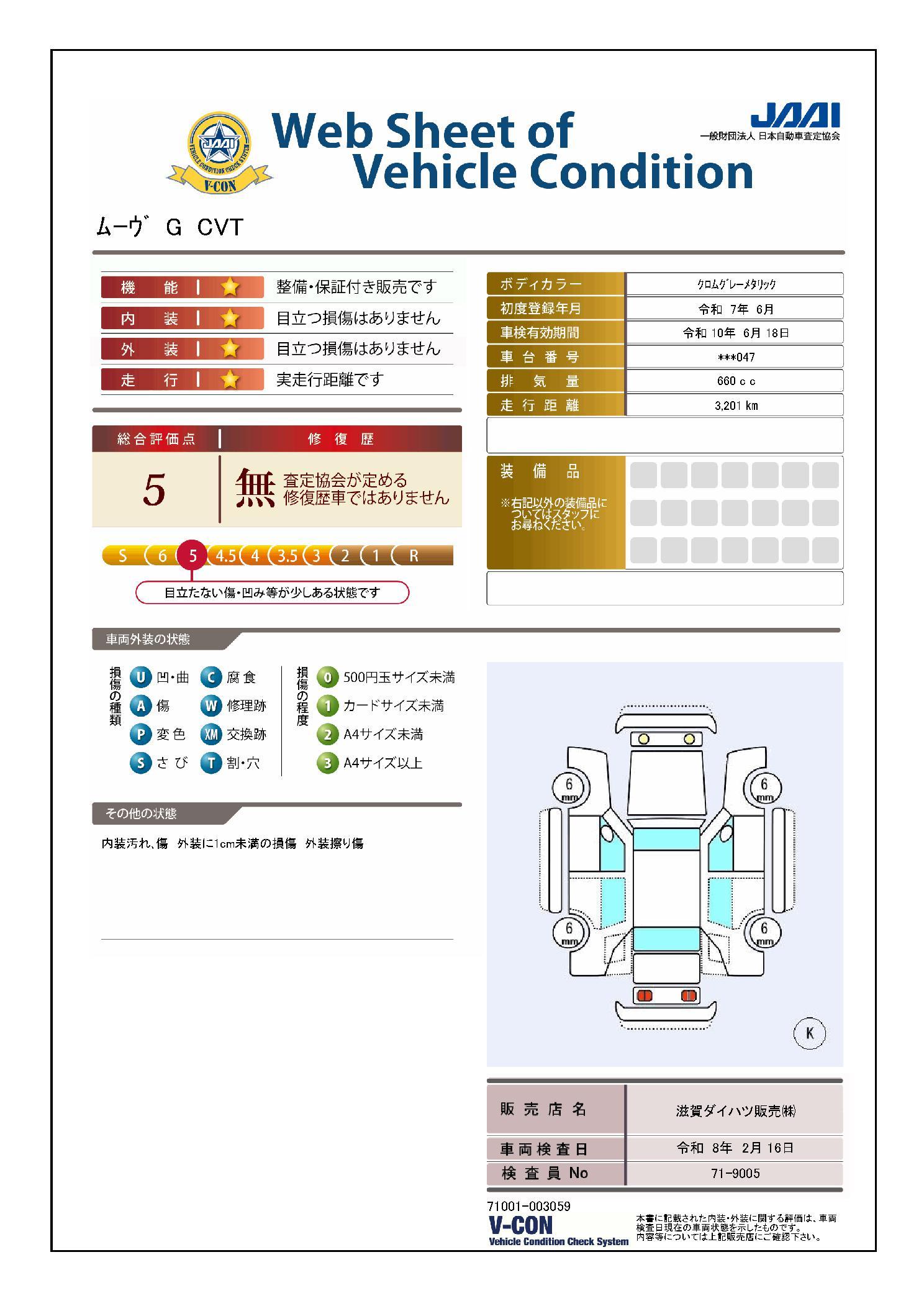 クルマの状態と評価点数を開示し、図解で表示いたしております。車両状態検査書はこちらの車両ページで閲覧できます。(※一部評価書が未設置の車両がある場合がございます)