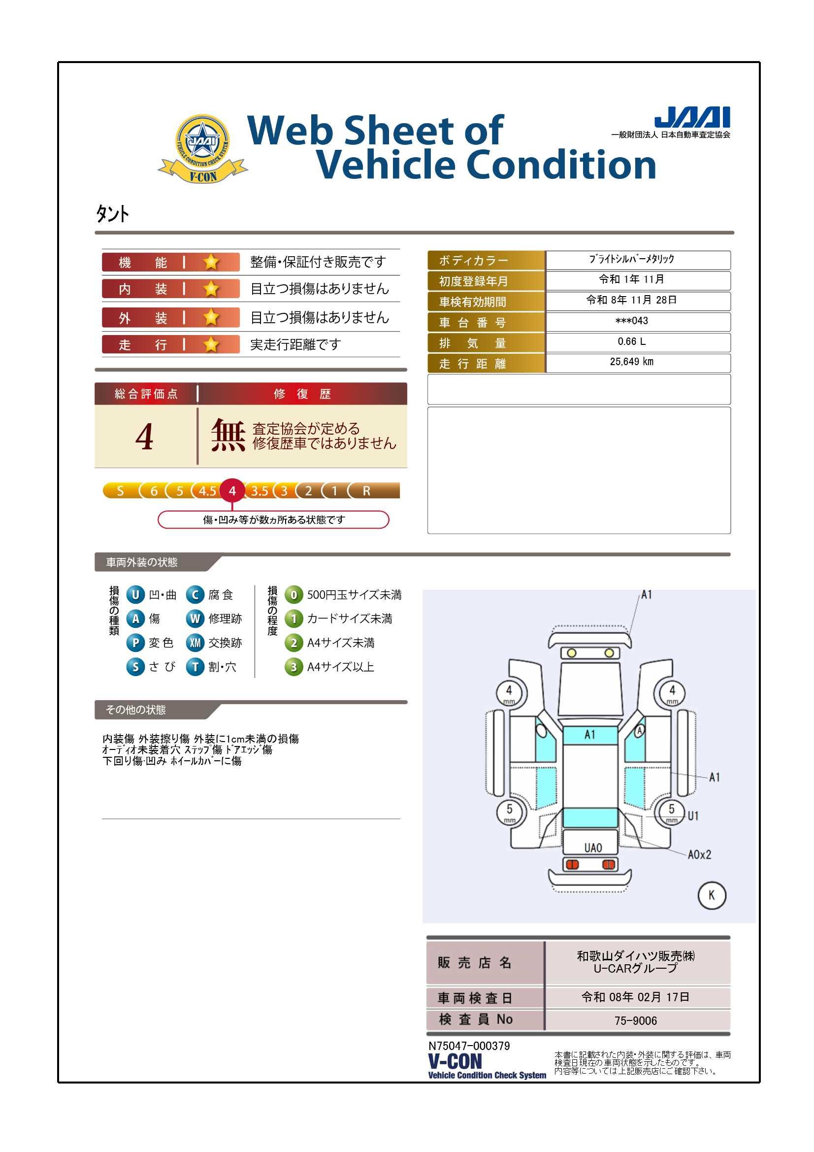 一般財団法人 日本自動車査定協会の車両状態証明書となります。