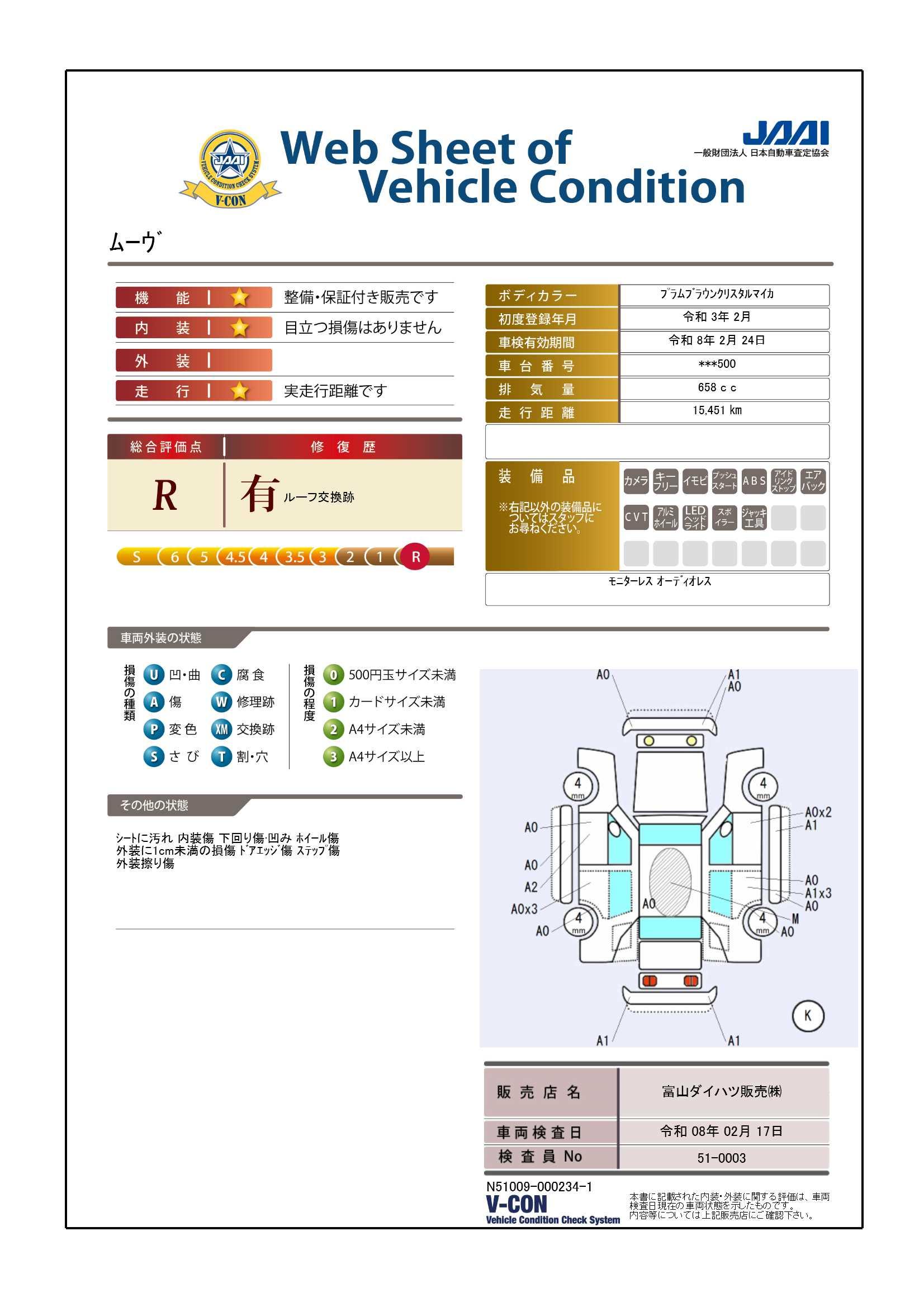 車両状態証明書の見方となります。検査団体によって、表記方法が異なりますので該当車両の車両状態証明書を御確認の上、ご覧ください。