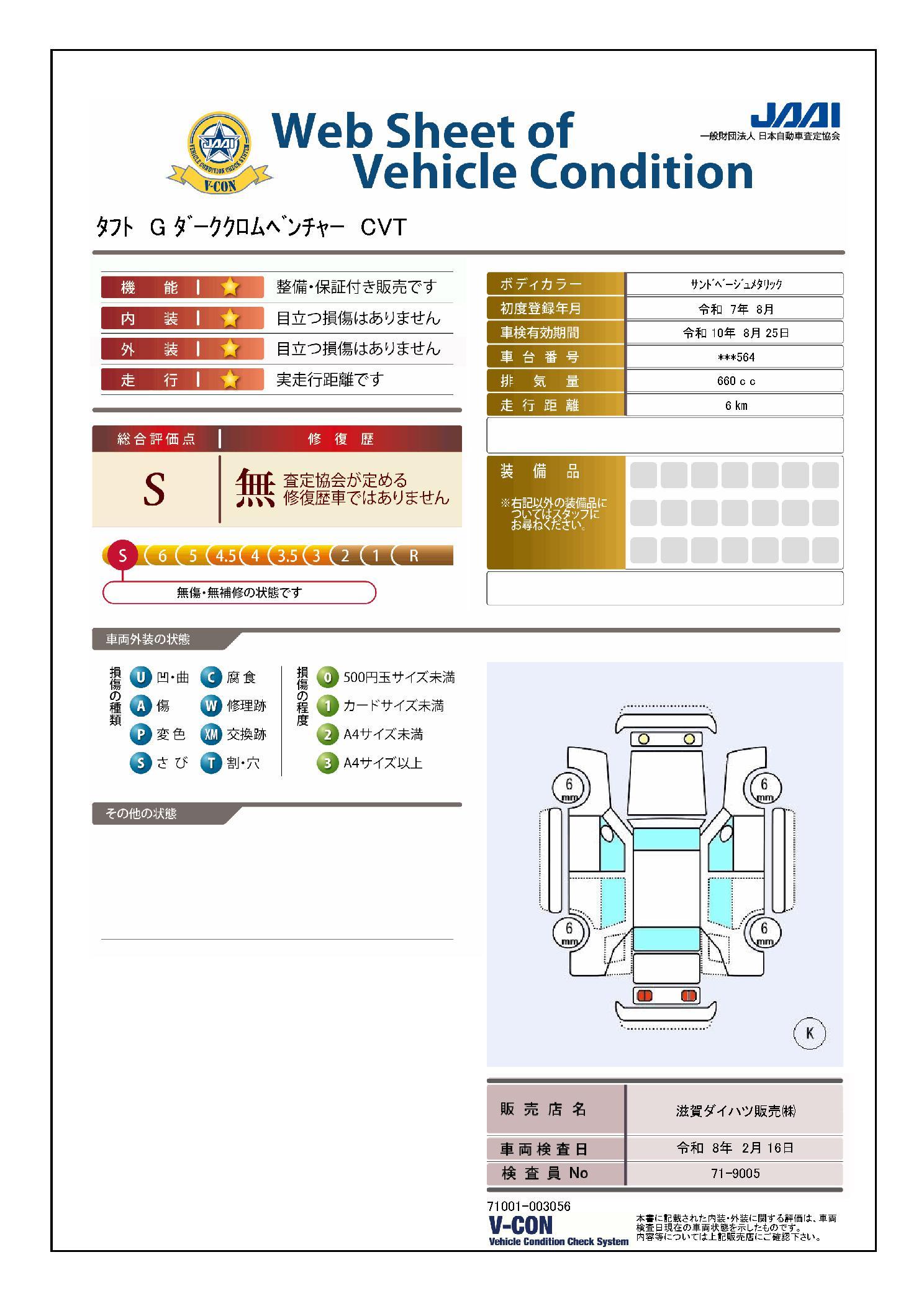 クルマの状態と評価点数を開示し、図解で表示いたしております。車両状態検査書はこちらの車両ページで閲覧できます。(※一部評価書が未設置の車両がある場合がございます)