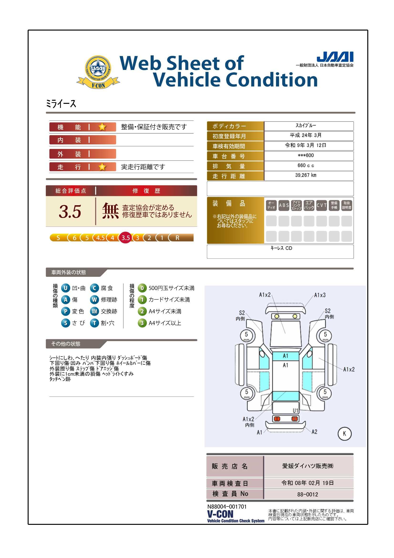 車両状態証明書修復歴の有無も一目瞭然。機能や内装・外装、走行距離、修復歴の有無をチェックし、クルマの状態を10段階にした車両状態証明書。数字や記号を使ってわかりやすく表示しています。