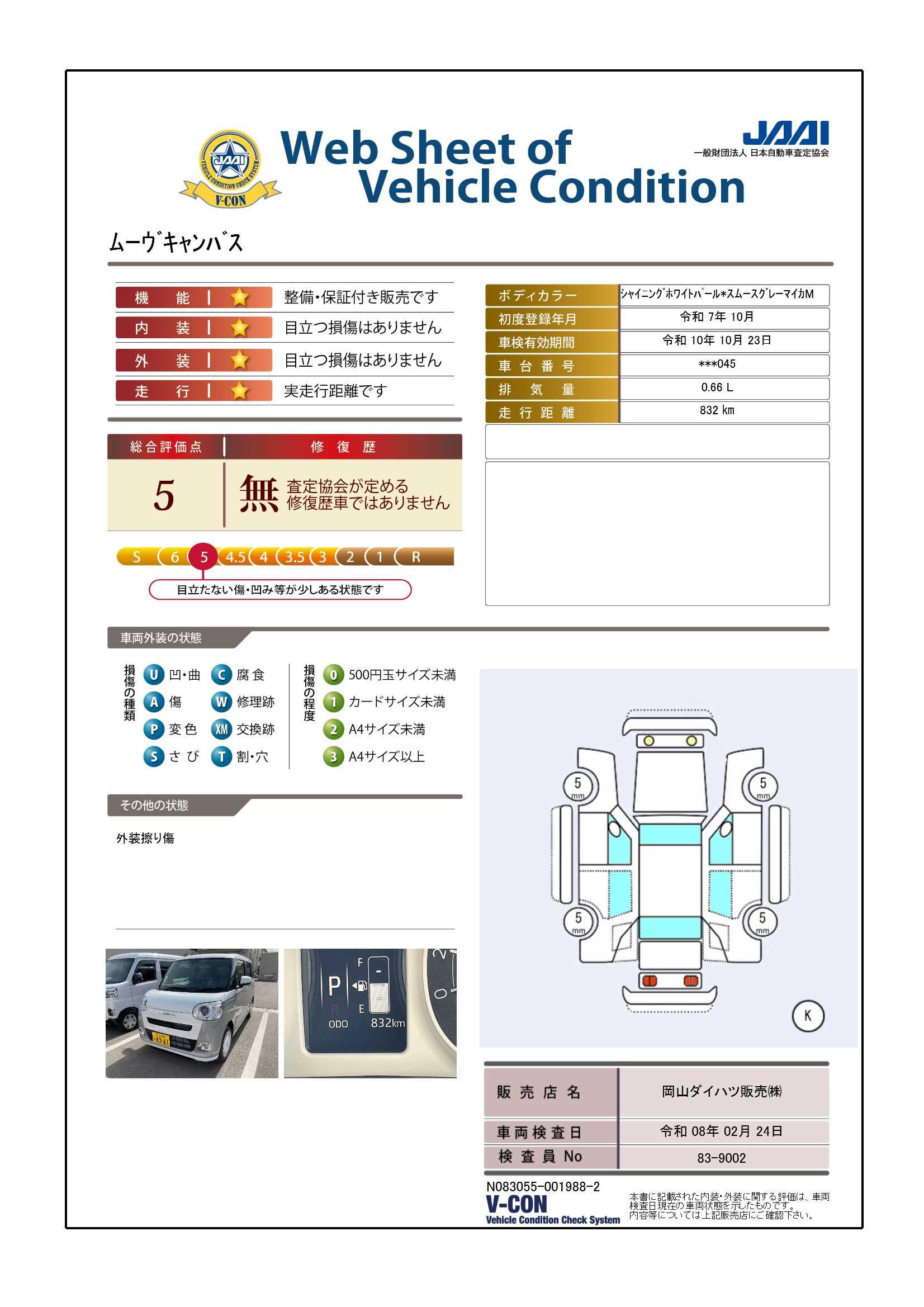 現状の車両の状態に関しましては必ず販売店に確認をお願いします。(2008年10月からの評価基準改定により、一部の車両につき店頭の評価表記と違う場合がございます。詳しくは販売店にお問い合わせください。