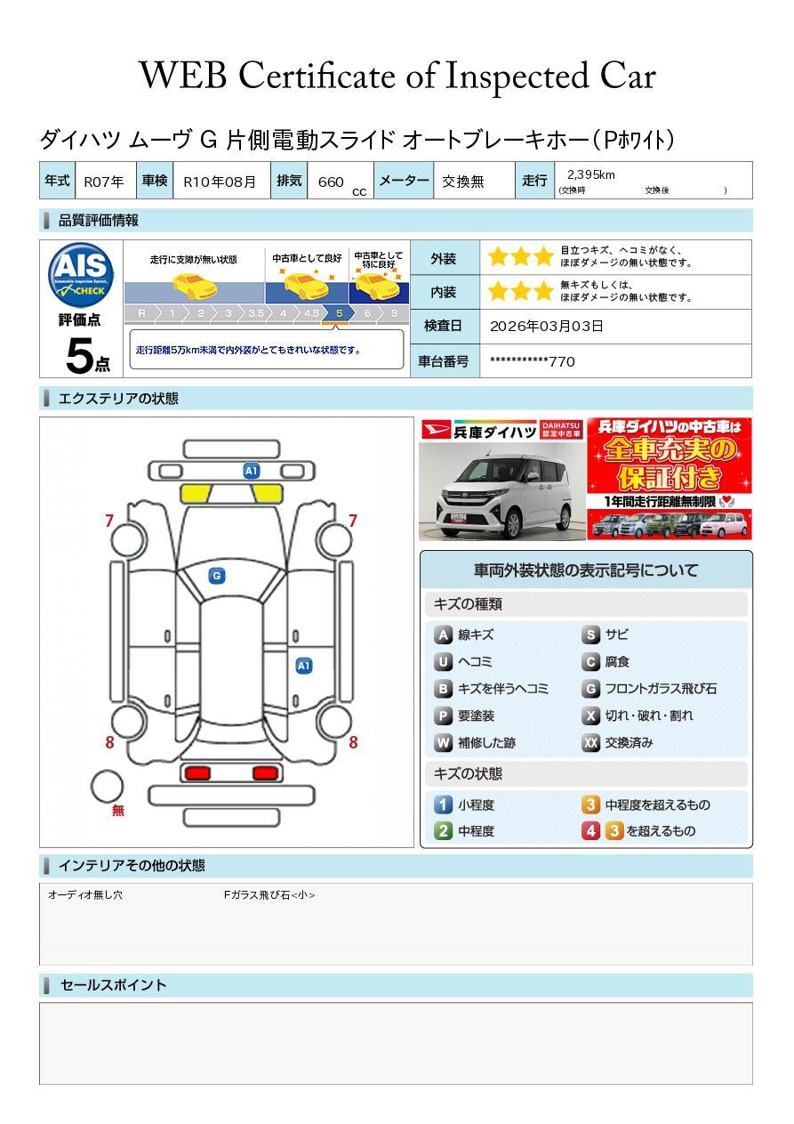 車両状態証明書が付いておりますので、安心してお選び出来ます。詳しくは、スタッフまでお気軽にお問合せください。