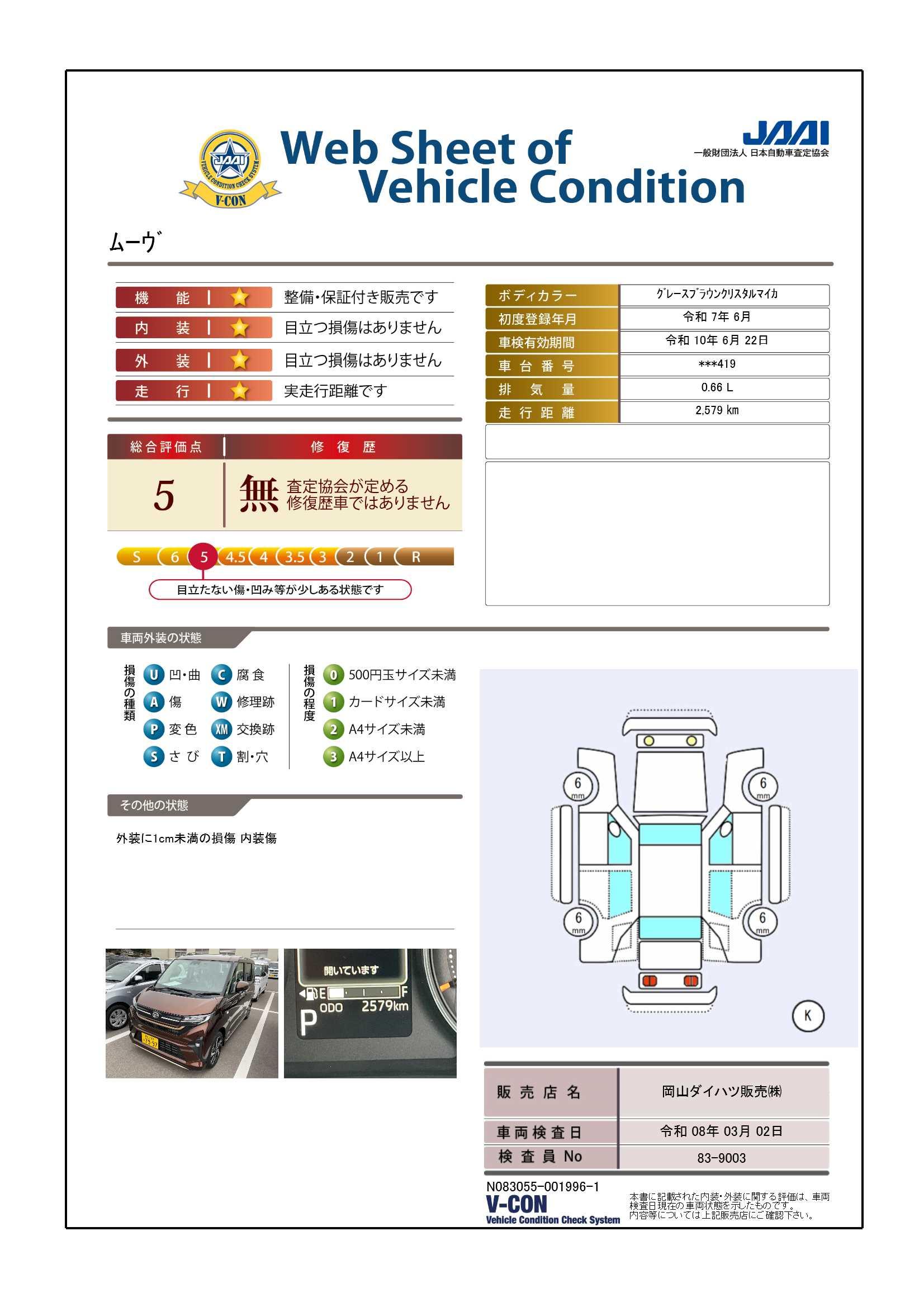 現状の車両の状態に関しましては必ず販売店に確認をお願いします。(2008年10月からの評価基準改定により、一部の車両につき店頭の評価表記と違う場合がございます。詳しくは販売店にお問い合わせください。