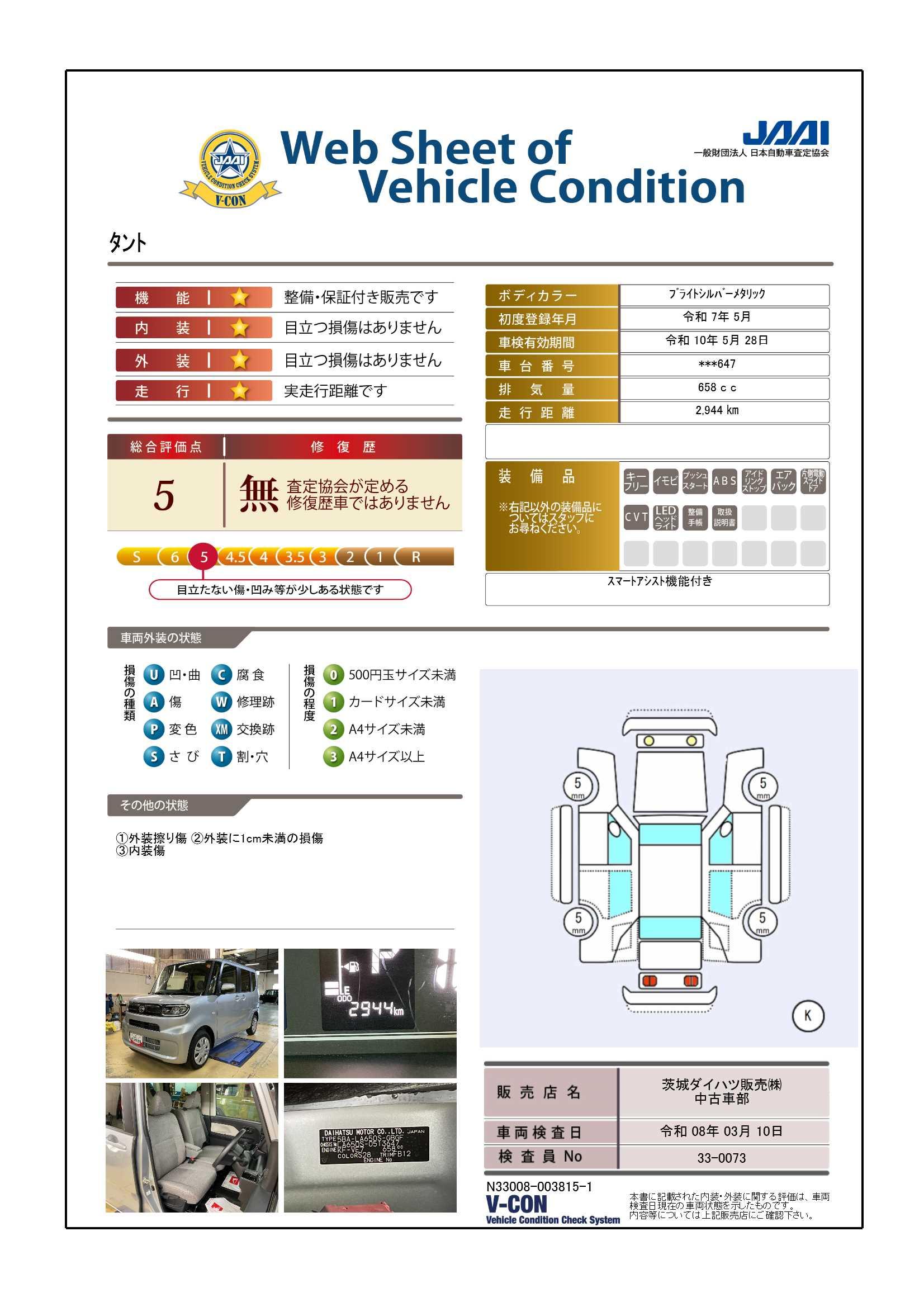 安心3【状態】車両状態証明書でキズや修復歴の有無を確認できます!気になる点は事前にご説明いたします♪