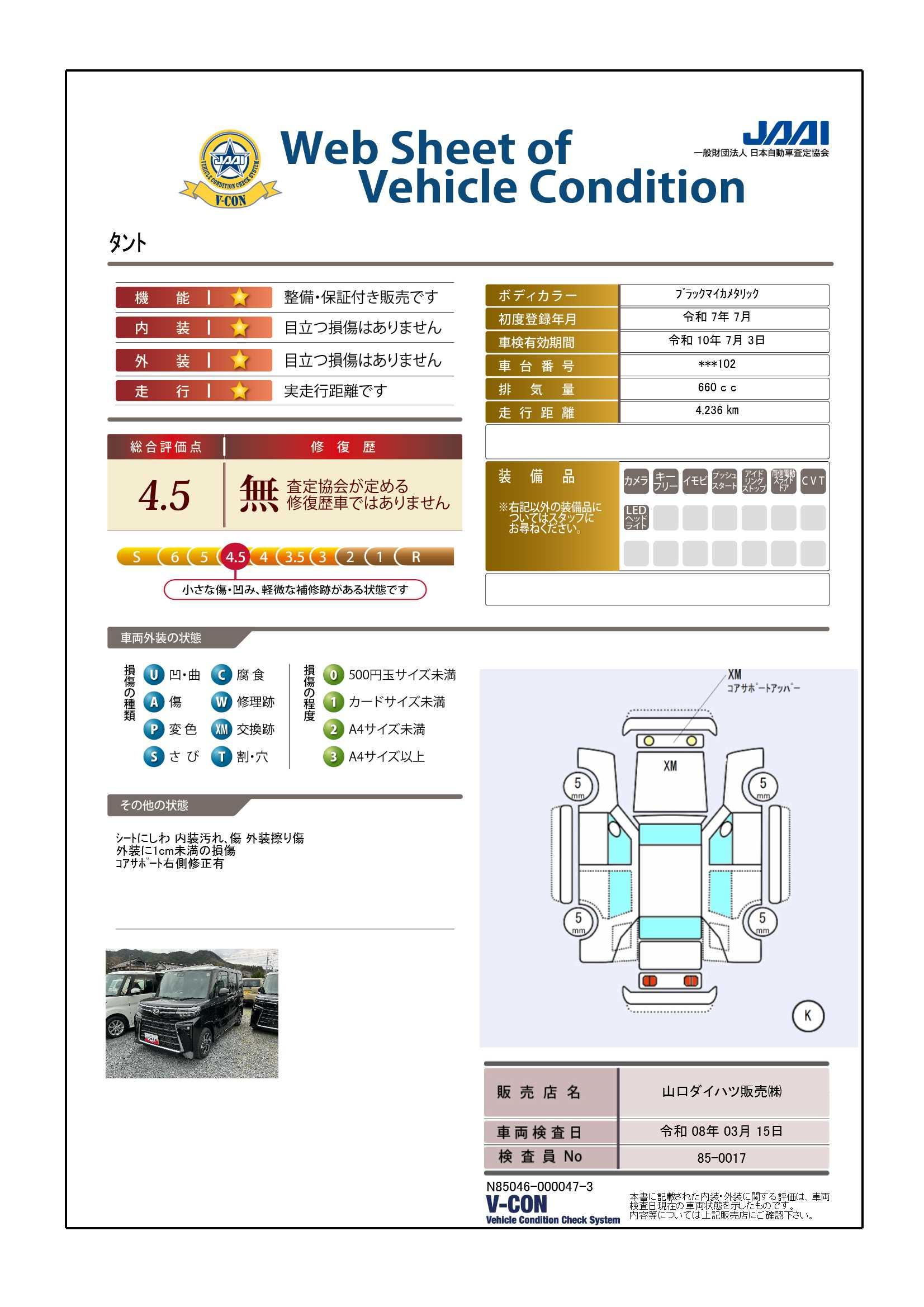 現状の車両の状態に関しましては必ず販売店に確認をお願いします。(2008年10月からの評価基準改定により、一部の車両につき店頭の評価表記と違う場合がございます。詳しくは販売店にお問い合わせください。