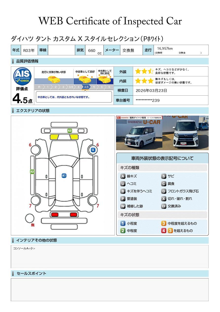 ダイハツ認定中古車なら展示車両の状態を開示しております。展示車両に自信があるからこそ出来るサービスです。