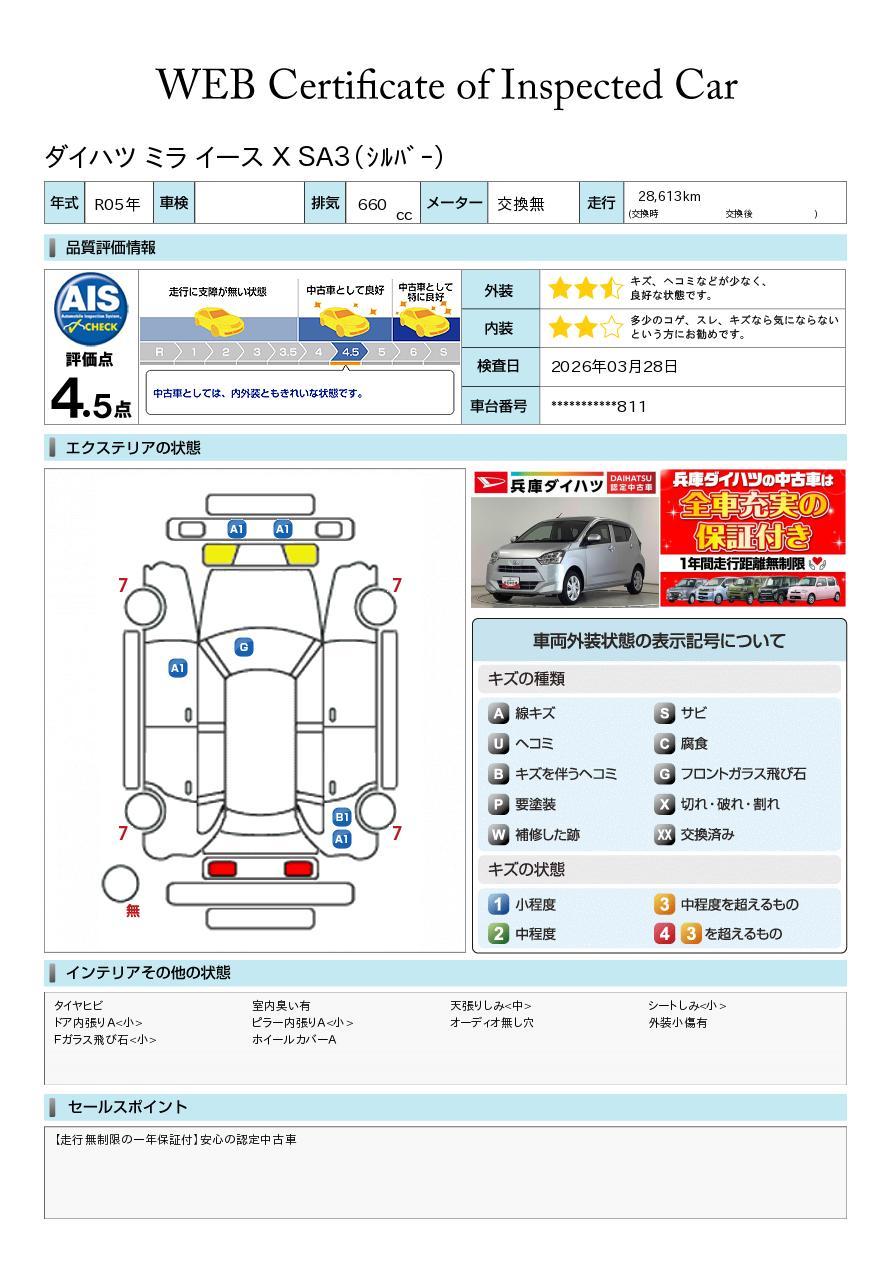 車両状態証明書が付いておりますので、安心してお選び出来ます。詳しくは、スタッフまでお気軽にお問合せください。