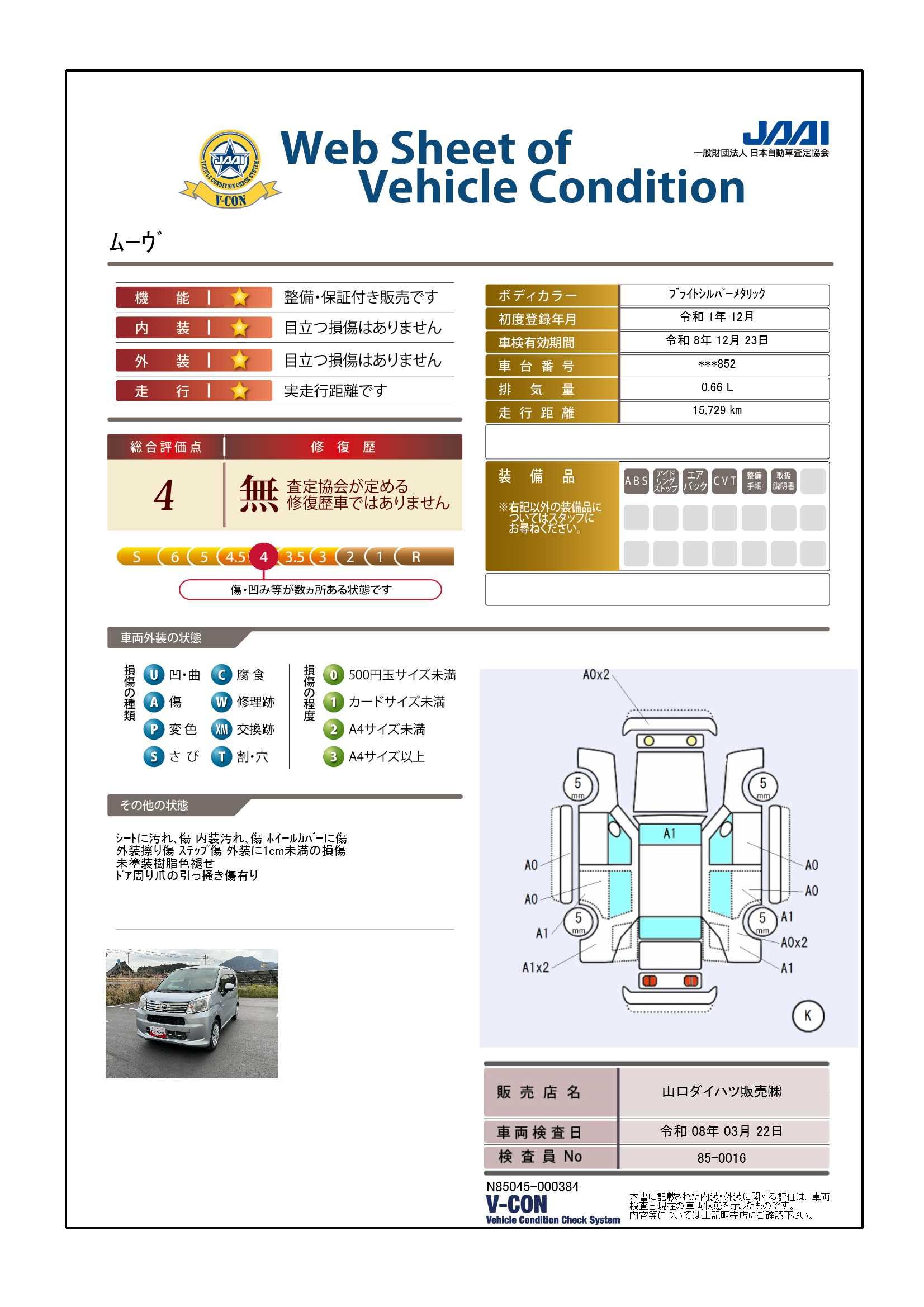 現状の車両の状態に関しましては必ず販売店に確認をお願いします。(2008年10月からの評価基準改定により、一部の車両につき店頭の評価表記と違う場合がございます。詳しくは販売店にお問い合わせください。