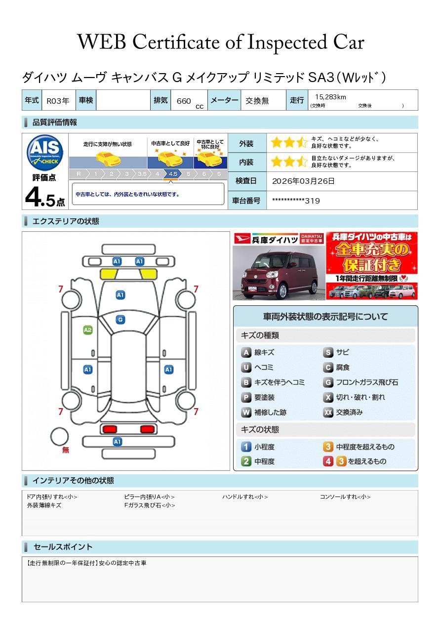 【第三者機関の車両品質評価書付き】車の状態が詳しくわかる車両状態証明書が付いておりますので、安心してお選びいただけます!詳しくはスタッフまでお気軽にお問合せください☆
